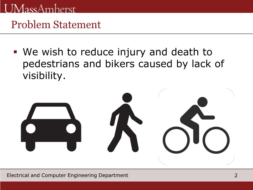 Problem Statement • We wish to reduce injury and death to pedestrians and bikers caused by lack of visibility.