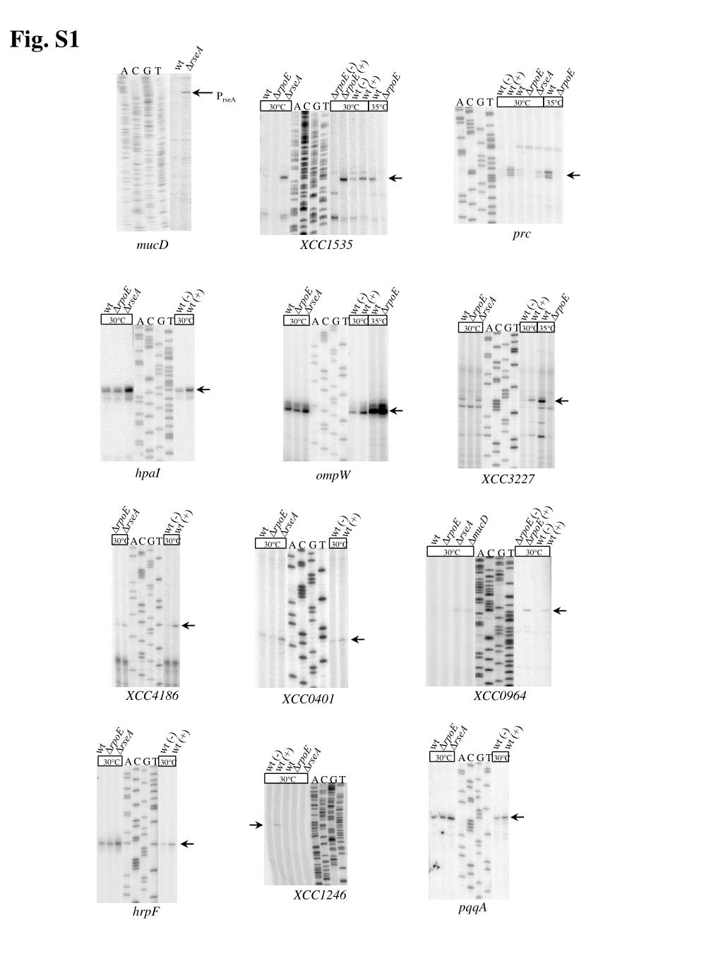Supplemental Figure 1: Determination of transcription start sites of a subset of σE target promoters by primer extension assays. Total RNA from WT, DrpoE, DrseA, DmucD and WT or DrpoE strains containing control plasmid p917 (-) or σE-overexpressing plasmid p917-rpoE (+) were used as templates in primer extension experiments when suited. Total RNAs were obtained from cells incubated at 30°C or after a 60 min. shift at 35°C. Primers K, xcc1535-EXT, xcc0964-EXT, hrpF-EXT, hpa1-EXT, xcc1246, ompW-EXT, pqqA-EXT, xcc0401-EXT, prc-EXT, xcc4186-EXT and xcc3227-EXT were 5' end labeled with 32P and extended with reverse transcriptase to map their corresponding gene promoter sequences. The arrowheads indicate the bands corresponding to the main start sites observed.