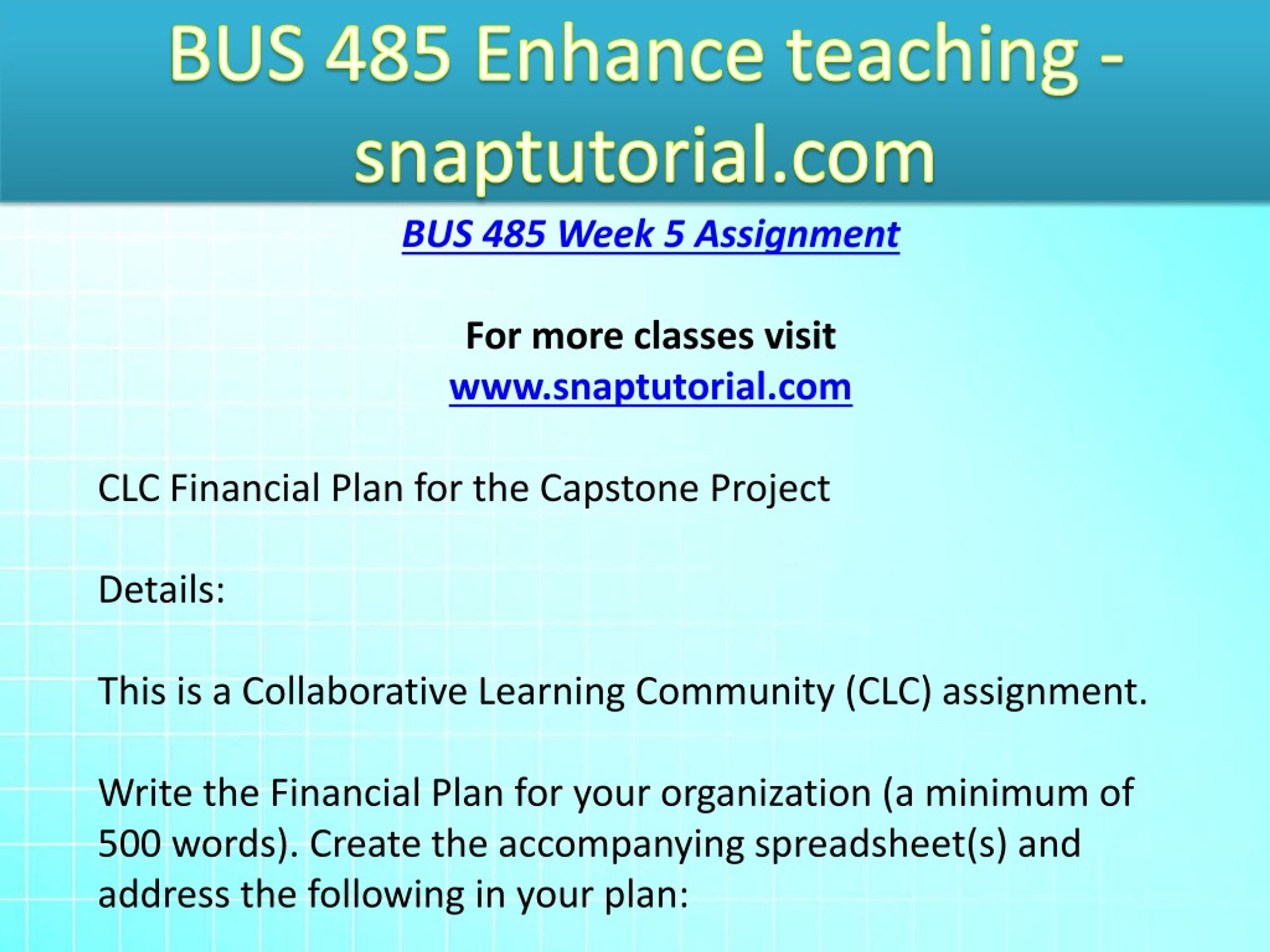 BUS 485 Enhance teaching - snaptutorial.com BUS 485 Week 5 Assignment For more classes visit www.snaptutorial.com CLC Financial Plan for the Capstone Project Details: This is a Collaborative Learning Community (CLC) assignment. Write the Financial Plan for your organization (a minimum of 500 words). Create the accompanying spreadsheet(s) and address the following in your plan: