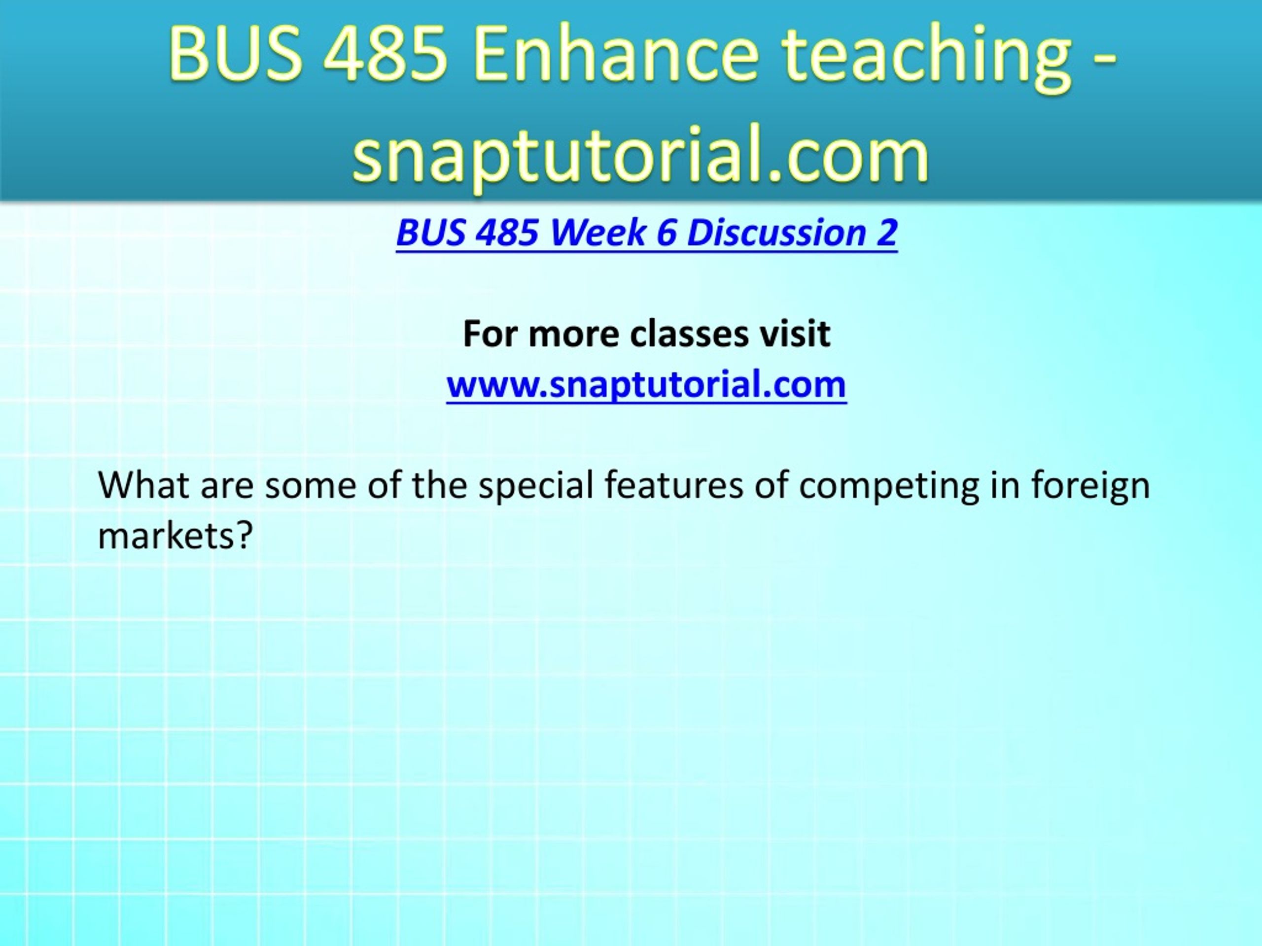 BUS 485 Enhance teaching - snaptutorial.com BUS 485 Week 6 Discussion 2 For more classes visit www.snaptutorial.com What are some of the special features of competing in foreign markets?