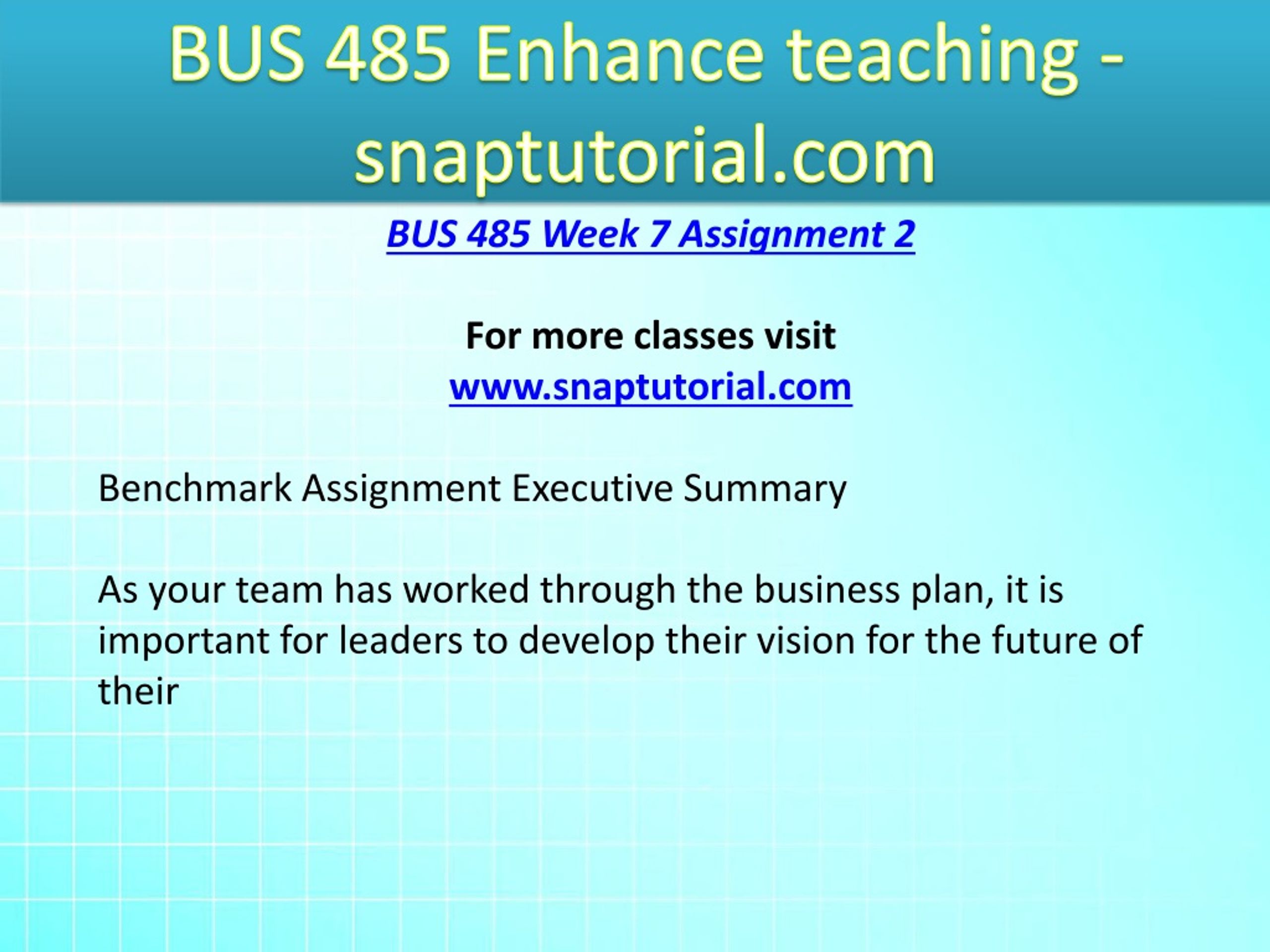 BUS 485 Enhance teaching - snaptutorial.com BUS 485 Week 7 Assignment 2 For more classes visit www.snaptutorial.com Benchmark Assignment Executive Summary As your team has worked through the business plan, it is important for leaders to develop their vision for the future of their