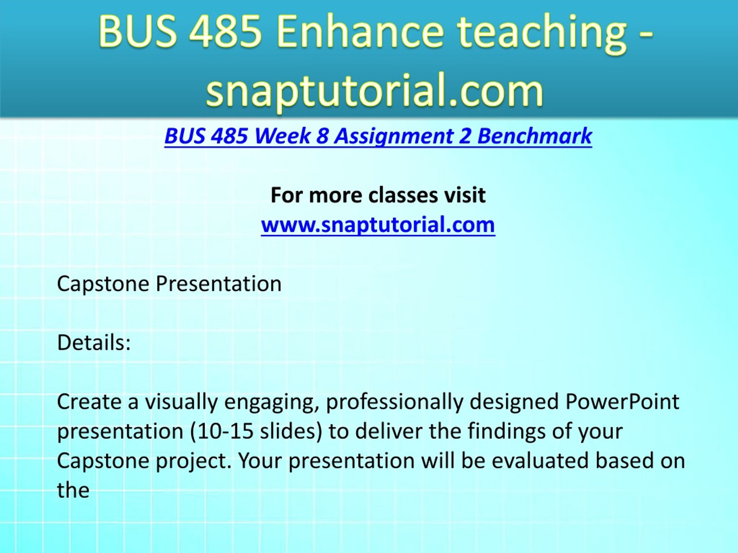 BUS 485 Enhance teaching - snaptutorial.com BUS 485 Week 8 Assignment 2 Benchmark For more classes visit www.snaptutorial.com Capstone Presentation Details: Create a visually engaging, professionally designed PowerPoint presentation (10-15 slides) to deliver the findings of your Capstone project. Your presentation will be evaluated based on the