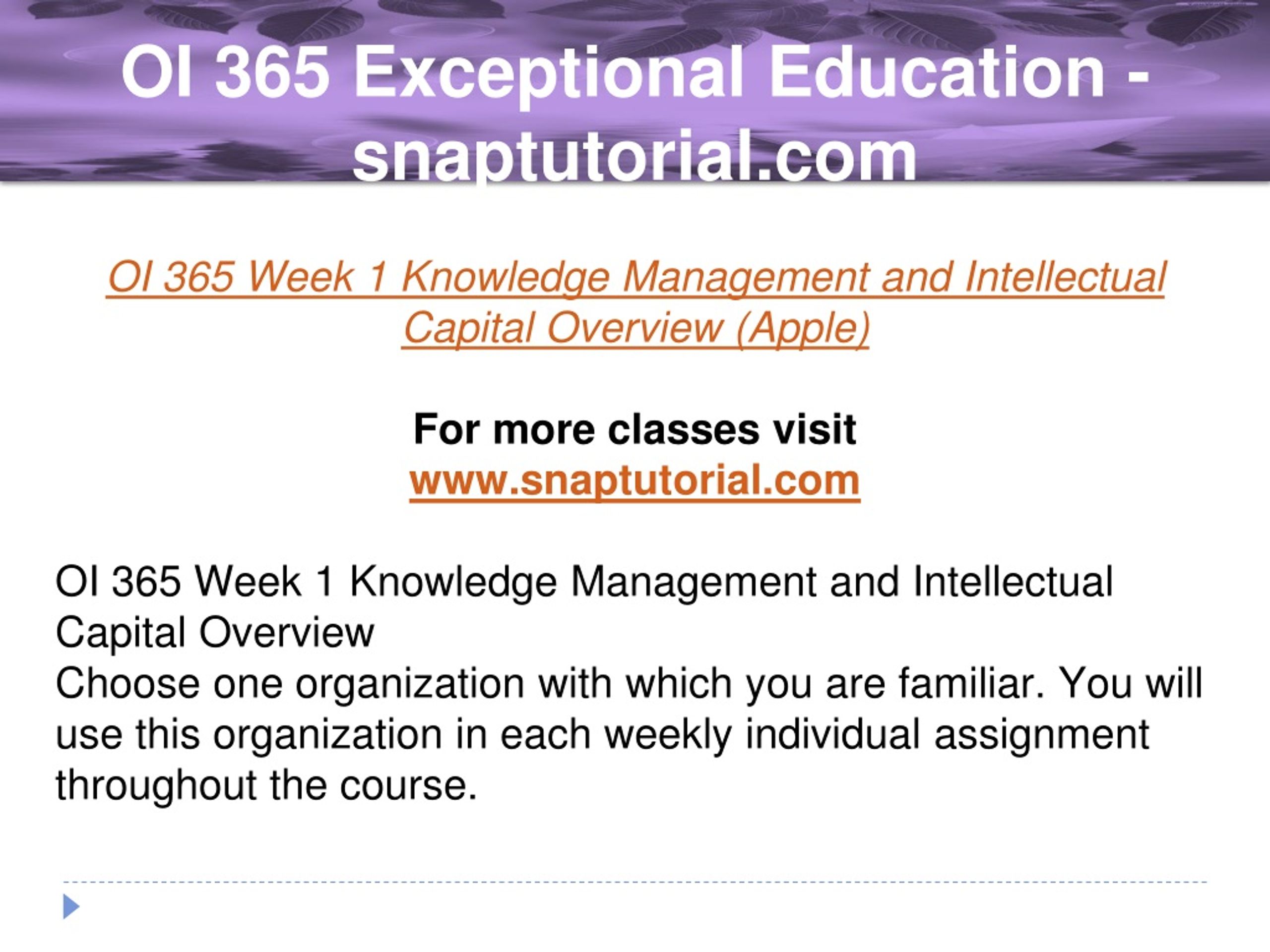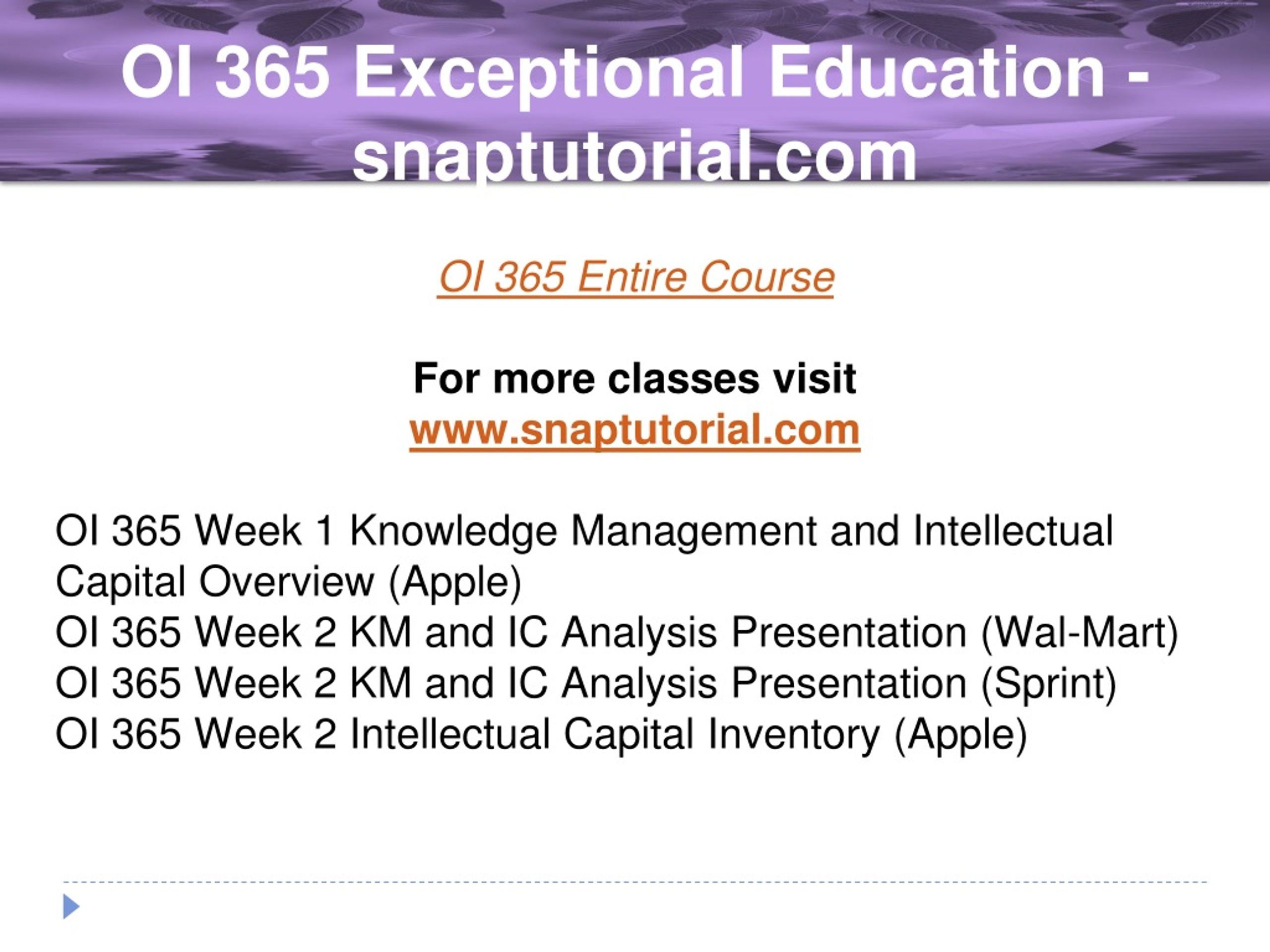OI 365 Exceptional Education - snaptutorial.com OI 365 Entire Course For more classes visit www.snaptutorial.com OI 365 Week 1 Knowledge Management and Intellectual Capital Overview (Apple) OI 365 Week 2 KM and IC Analysis Presentation (Wal-Mart) OI 365 Week 2 KM and IC Analysis Presentation (Sprint) OI 365 Week 2 Intellectual Capital Inventory (Apple)