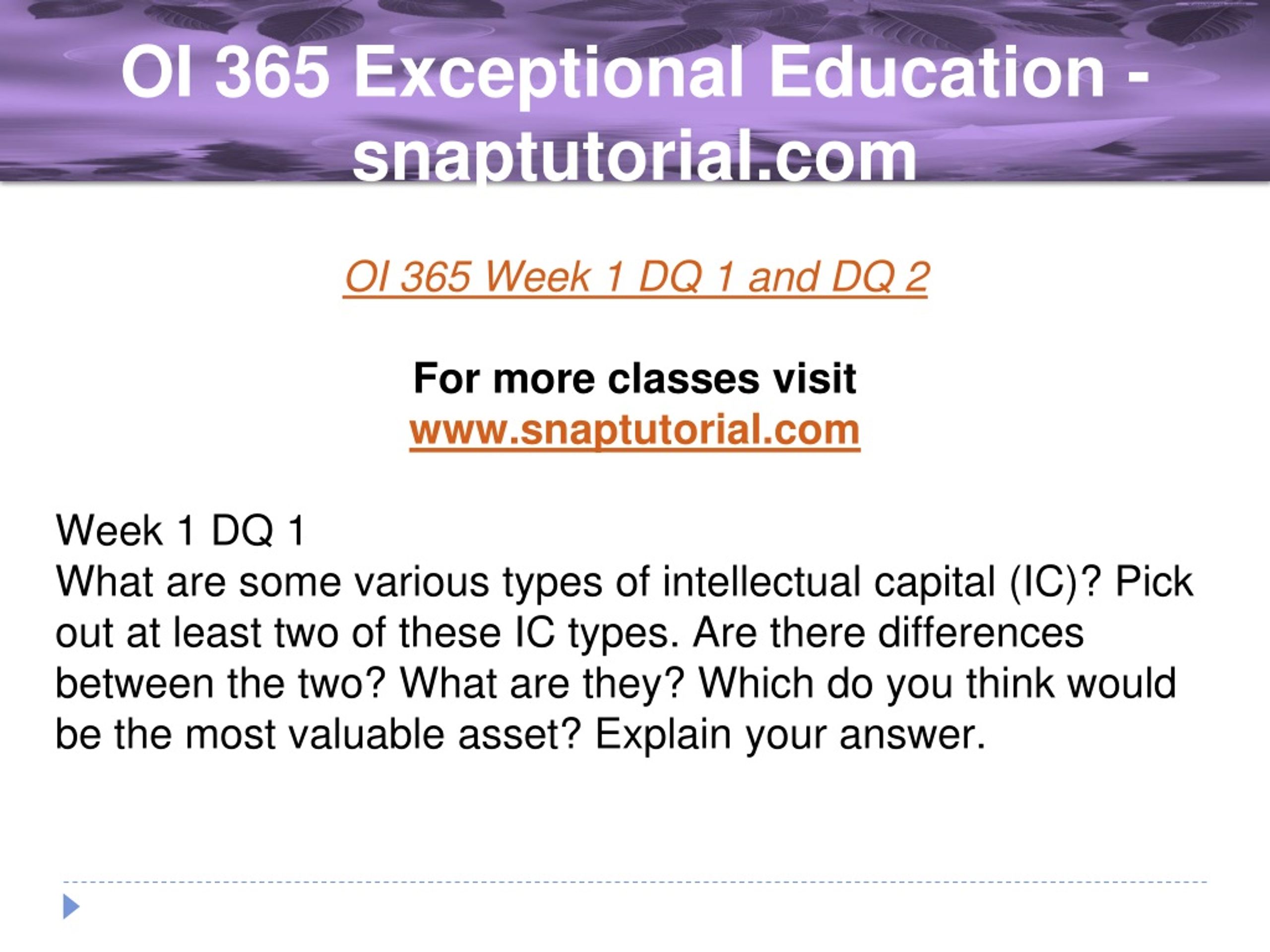 OI 365 Exceptional Education - snaptutorial.com OI 365 Week 1 DQ 1 and DQ 2 For more classes visit www.snaptutorial.com Week 1 DQ 1 What are some various types of intellectual capital (IC)? Pick out at least two of these IC types. Are there differences between the two? What are they? Which do you think would be the most valuable asset? Explain your answer.