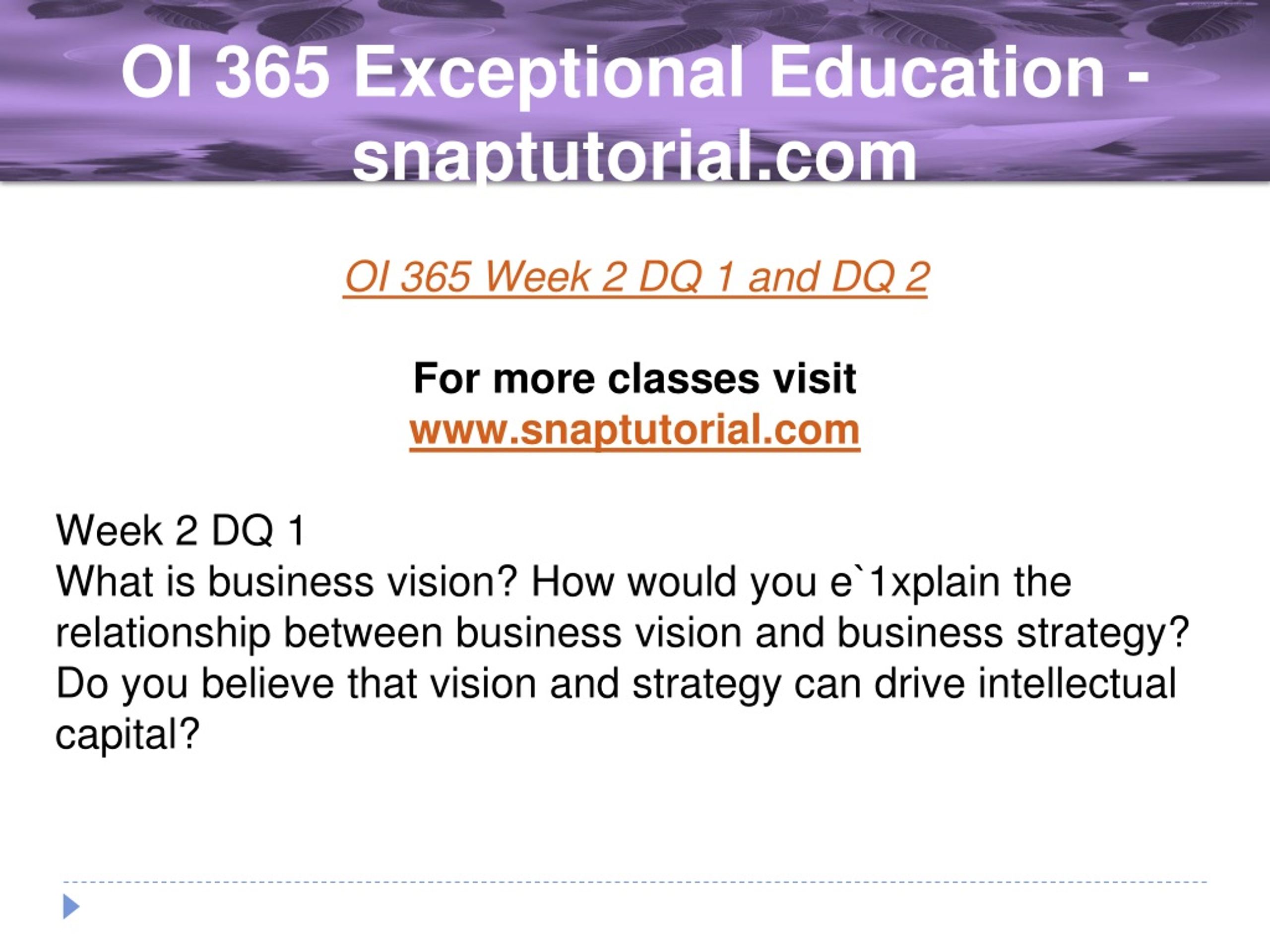 OI 365 Exceptional Education - snaptutorial.com OI 365 Week 2 DQ 1 and DQ 2 For more classes visit www.snaptutorial.com Week 2 DQ 1 What is business vision? How would you e`1xplain the relationship between business vision and business strategy? Do you believe that vision and strategy can drive intellectual capital?