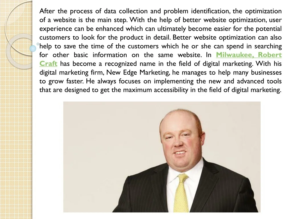 After the process of data collection and problem identification, the optimization of a website is the main step. With the help of better website optimization, user experience can be enhanced which can ultimately become easier for the potential customers to look for the product in detail. Better website optimization can also help to save the time of the customers which he or she can spend in searching for other basic information on the same website. In Milwaukee, Robert Craft has become a recognized name in the field of digital marketing. With his digital marketing firm, New Edge Marketing, he manages to help many businesses to grow faster. He always focuses on implementing the new and advanced tools that are designed to get the maximum accessibility in the field of digital marketing.