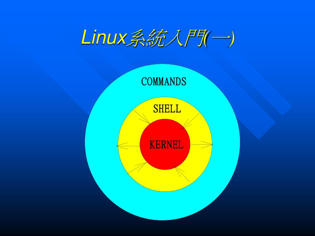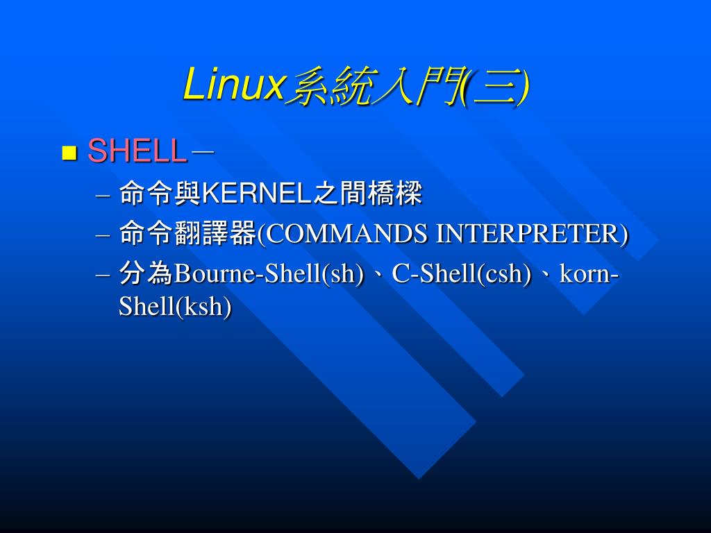 Linux系統入門(三) • SHELL- • 命令與KERNEL之間橋樑 • 命令翻譯器(COMMANDS INTERPRETER) • 分為Bourne-Shell(sh)、C-Shell(csh)、korn-Shell(ksh)
