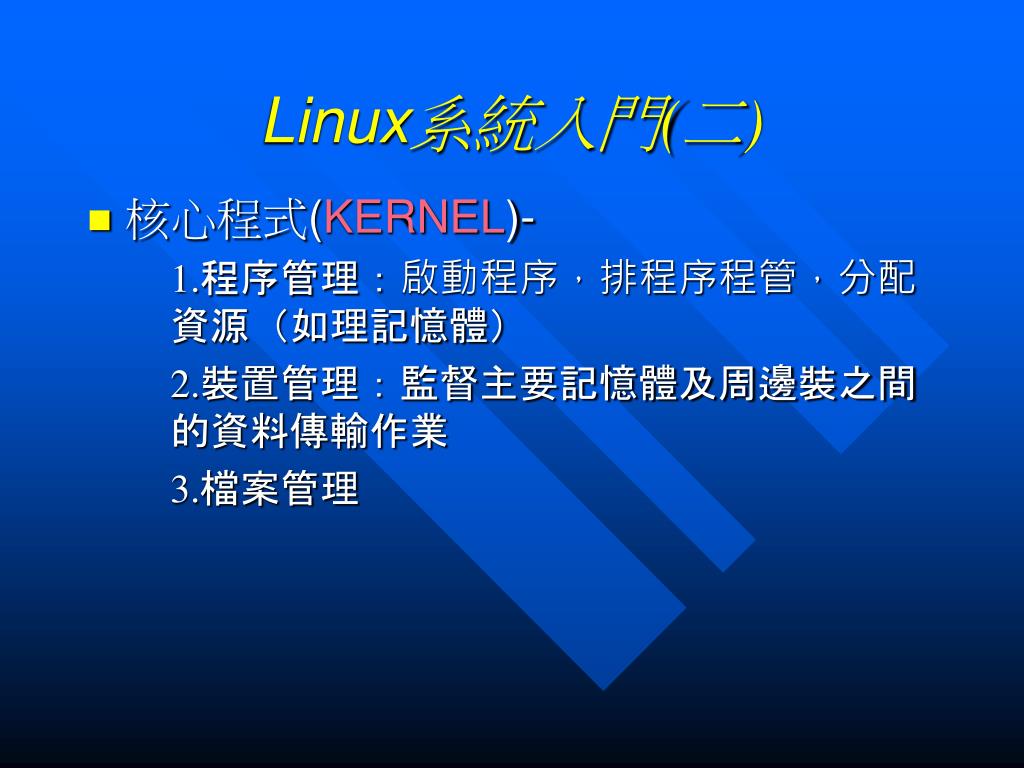 Linux系統入門(二) • 核心程式(KERNEL)- • 1.程序管理:啟動程序,排程序程管,分配資源(如理記憶體) • 2.裝置管理:監督主要記憶體及周邊裝之間的資料傳輸作業 • 3.檔案管理