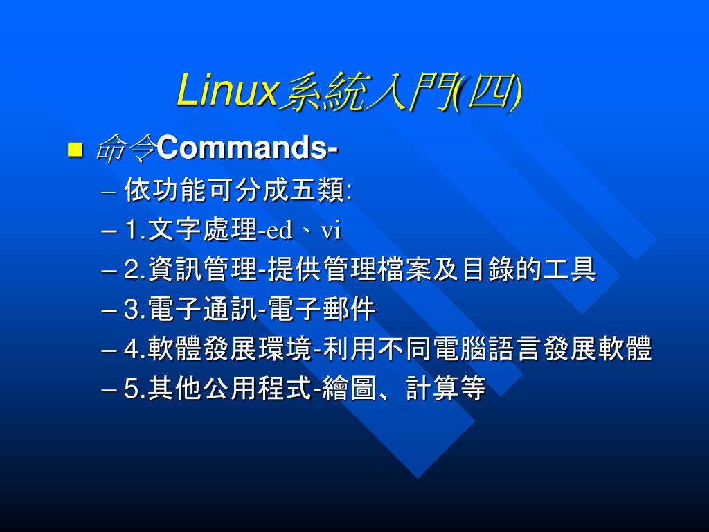 Linux系統入門(四) • 命令Commands- • 依功能可分成五類: • 1.文字處理-ed、vi • 2.資訊管理-提供管理檔案及目錄的工具 • 3.電子通訊-電子郵件 • 4.軟體發展環境-利用不同電腦語言發展軟體 • 5.其他公用程式-繪圖、計算等
