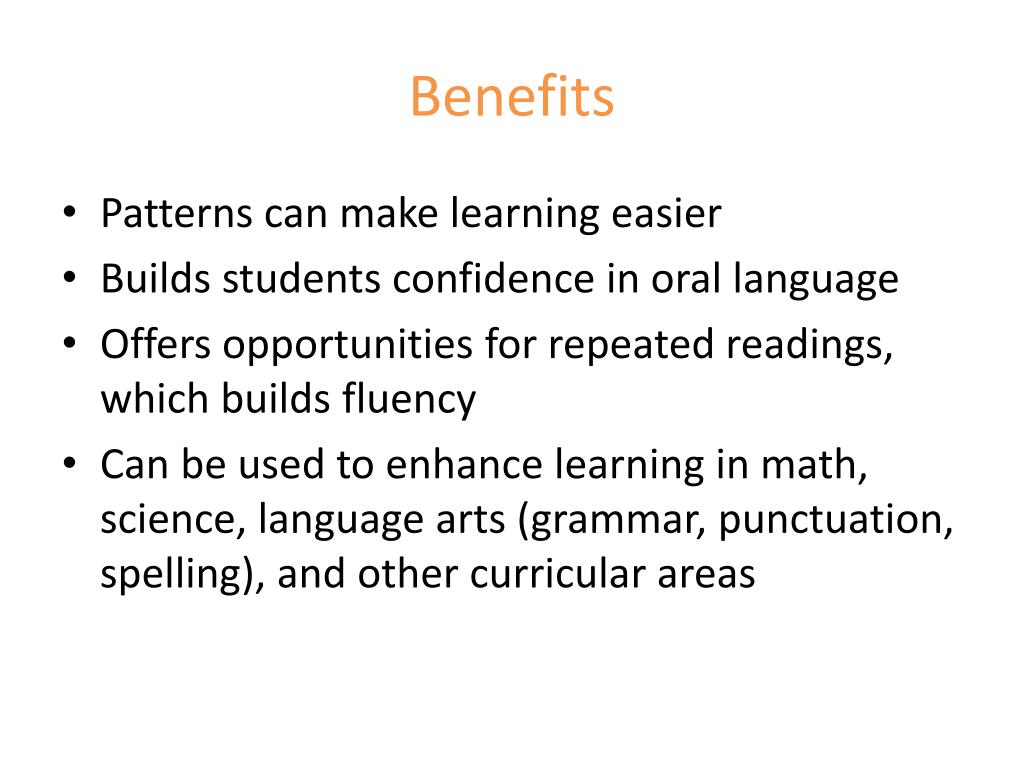 Benefits • Patterns can make learning easier • Builds students confidence in oral language • Offers opportunities for repeated readings, which builds fluency • Can be used to enhance learning in math, science, language arts (grammar, punctuation, spelling), and other curricular areas