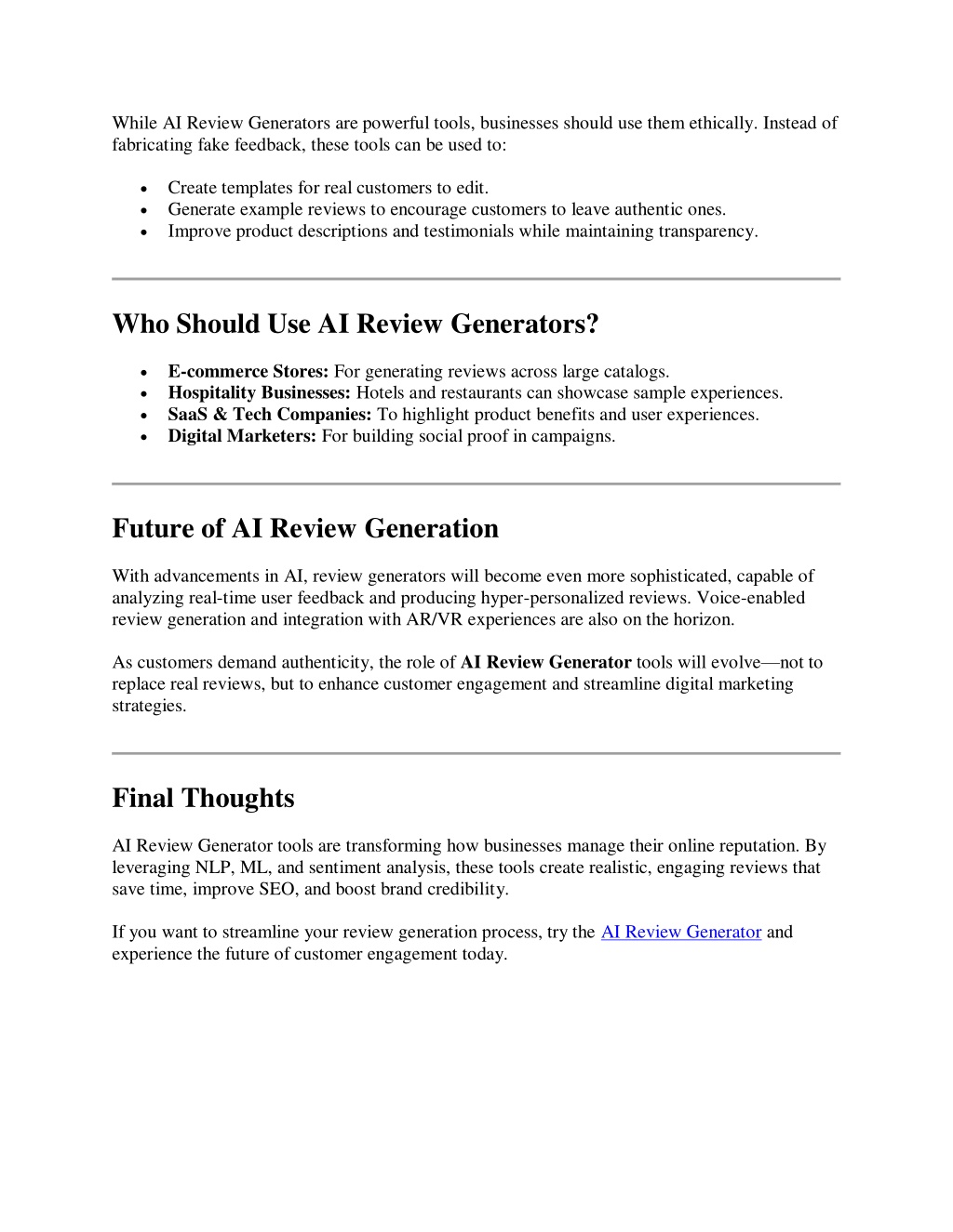 While AI Review Generators are powerful tools, businesses should use them ethically. Instead of fabricating fake feedback, these tools can be used to: Create templates for real customers to edit. Generate example reviews to encourage customers to leave authentic ones. Improve product descriptions and testimonials while maintaining transparency. Who Should Use AI Review Generators? E-commerce Stores: For generating reviews across large catalogs. Hospitality Businesses: Hotels and restaurants can showcase sample experiences. SaaS & Tech Companies: To highlight product benefits and user experiences. Digital Marketers: For building social proof in campaigns. Future of AI Review Generation With advancements in AI, review generators will become even more sophisticated, capable of analyzing real-time user feedback and producing hyper-personalized reviews. Voice-enabled review generation and integration with AR/VR experiences are also on the horizon. As customers demand authenticity, the role of AI Review Generator tools will evolve—not to replace real reviews, but to enhance customer engagement and streamline digital marketing strategies. Final Thoughts AI Review Generator tools are transforming how businesses manage their online reputation. By leveraging NLP, ML, and sentiment analysis, these tools create realistic, engaging reviews that save time, improve SEO, and boost brand credibility. If you want to streamline your review generation process, try the AI Review Generator and experience the future of customer engagement today.