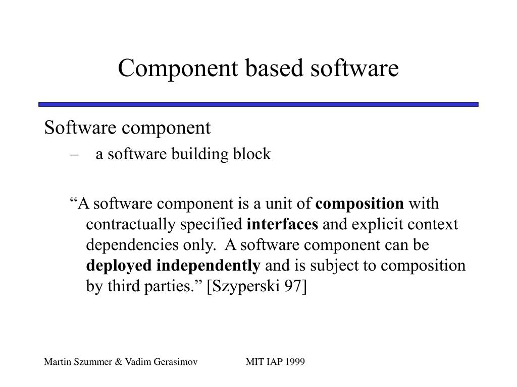Component based software Software component • a software building block “A software component is a unit of composition with contractually specified interfaces and explicit context dependencies only. A software component can be deployed independently and is subject to composition by third parties.” [Szyperski 97] MIT IAP 1999