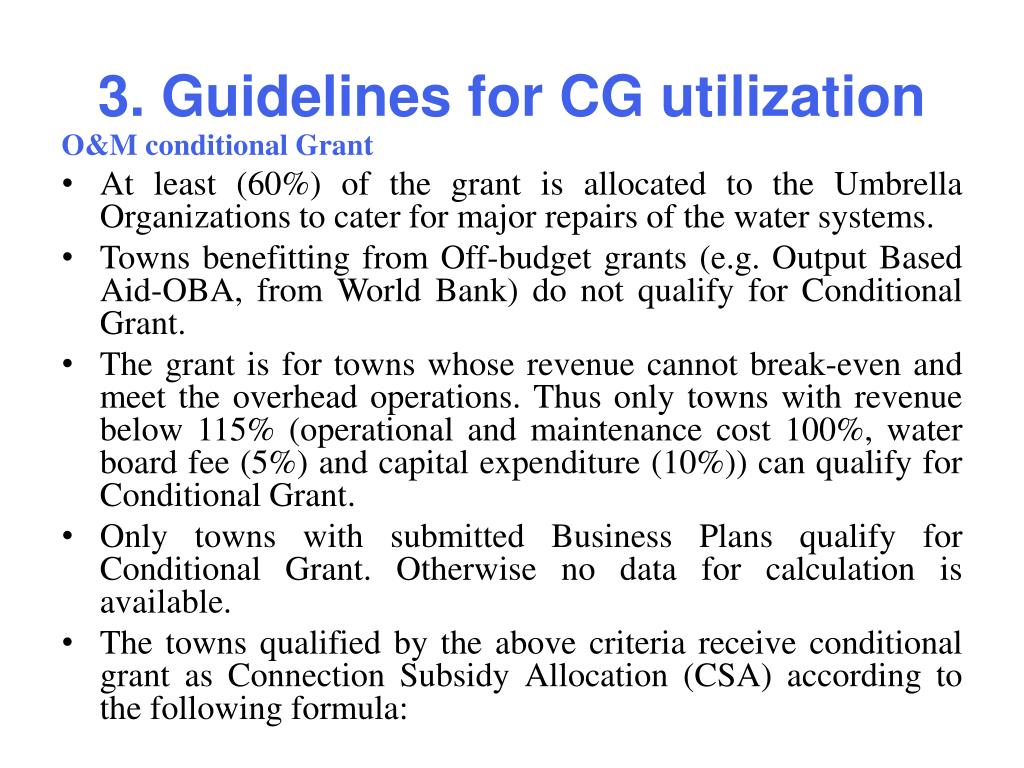 3. Guidelines for CG utilization O&M conditional Grant • At least (60%) of the grant is allocated to the Umbrella Organizations to cater for major repairs of the water systems. • Towns benefitting from Off-budget grants (e.g. Output Based Aid-OBA, from World Bank) do not qualify for Conditional Grant. • The grant is for towns whose revenue cannot break-even and meet the overhead operations. Thus only towns with revenue below 115% (operational and maintenance cost 100%, water board fee (5%) and capital expenditure (10%)) can qualify for Conditional Grant. • Only towns with submitted Business Plans qualify for Conditional Grant. Otherwise no data for calculation is available. • The towns qualified by the above criteria receive conditional grant as Connection Subsidy Allocation (CSA) according to the following formula: