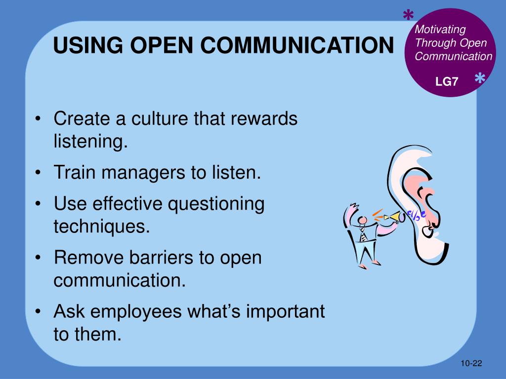 * Motivating Through Open Communication * LG7 • Create a culture that rewards listening. • Train managers to listen. • Use effective questioning techniques. • Remove barriers to open communication. • Ask employees what’s important to them. USING OPEN COMMUNICATION 10-22