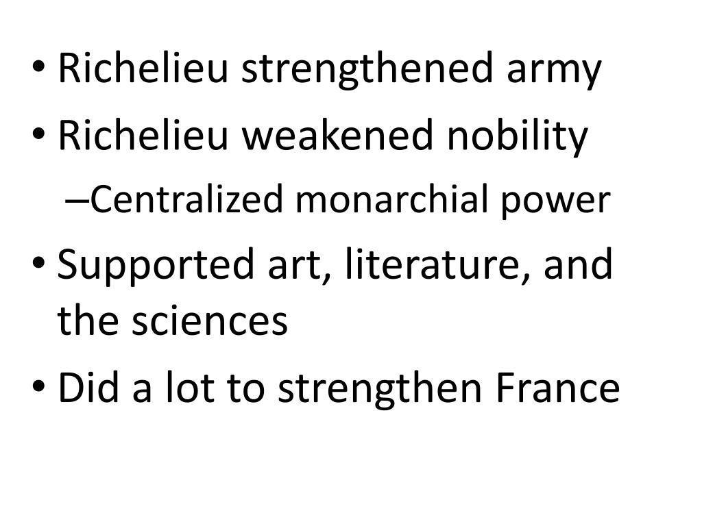 Richelieu strengthened army • Richelieu weakened nobility • Centralized monarchial power • Supported art, literature, and the sciences • Did a lot to strengthen France