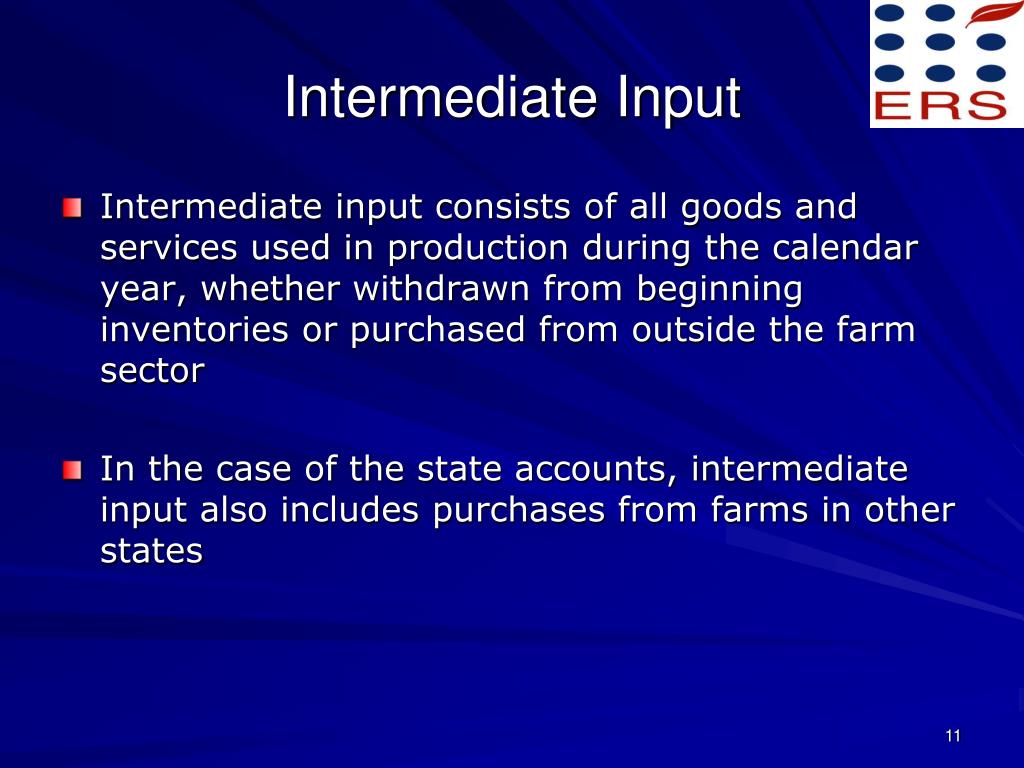 Intermediate Input Intermediate input consists of all goods and services used in production during the calendar year, whether withdrawn from beginning inventories or purchased from outside the farm sector In the case of the state accounts, intermediate input also includes purchases from farms in other states 11