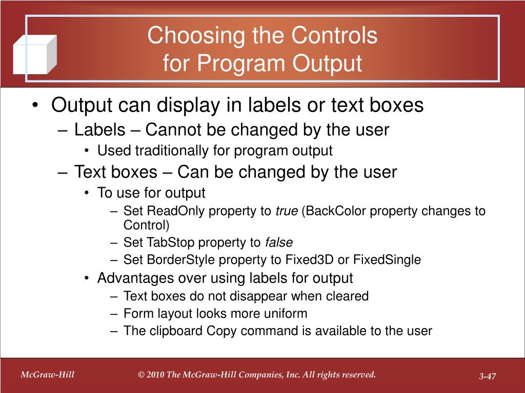 Choosing the Controlsfor Program Output • Output can display in labels or text boxes • Labels – Cannot be changed by the user • Used traditionally for program output • Text boxes – Can be changed by the user • To use for output • Set ReadOnly property to true (BackColor property changes to Control) • Set TabStop property to false • Set BorderStyle property to Fixed3D or FixedSingle • Advantages over using labels for output • Text boxes do not disappear when cleared • Form layout looks more uniform • The clipboard Copy command is available to the user