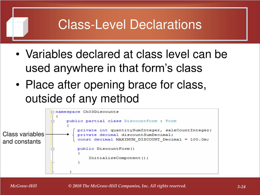 Class-Level Declarations • Variables declared at class level can be used anywhere in that form’s class • Place after opening brace for class, outside of any method Class variables and constants
