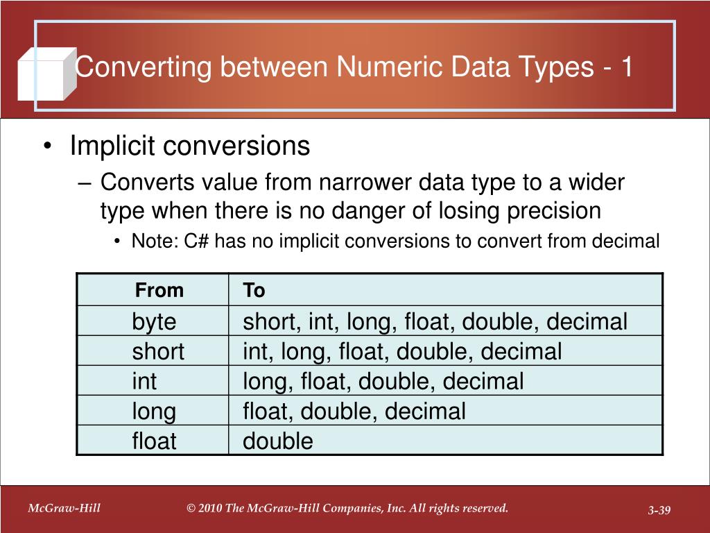 Converting between Numeric Data Types - 1 • Implicit conversions • Converts value from narrower data type to a wider type when there is no danger of losing precision • Note: C# has no implicit conversions to convert from decimal