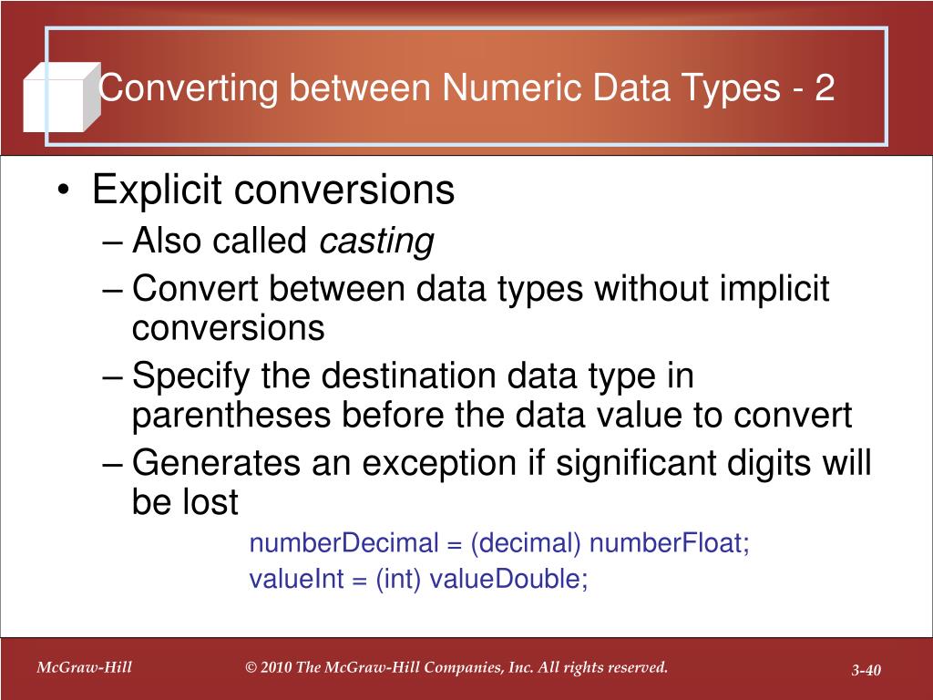 Converting between Numeric Data Types - 2 • Explicit conversions • Also called casting • Convert between data types without implicit conversions • Specify the destination data type in parentheses before the data value to convert • Generates an exception if significant digits will be lost numberDecimal = (decimal) numberFloat; valueInt = (int) valueDouble;