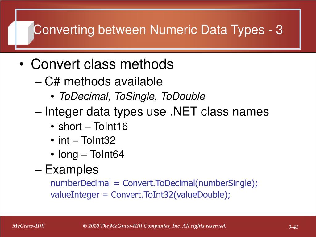 Converting between Numeric Data Types - 3 • Convert class methods • C# methods available • ToDecimal, ToSingle, ToDouble • Integer data types use .NET class names • short – ToInt16 • int – ToInt32 • long – ToInt64 • Examples numberDecimal = Convert.ToDecimal(numberSingle); valueInteger = Convert.ToInt32(valueDouble);
