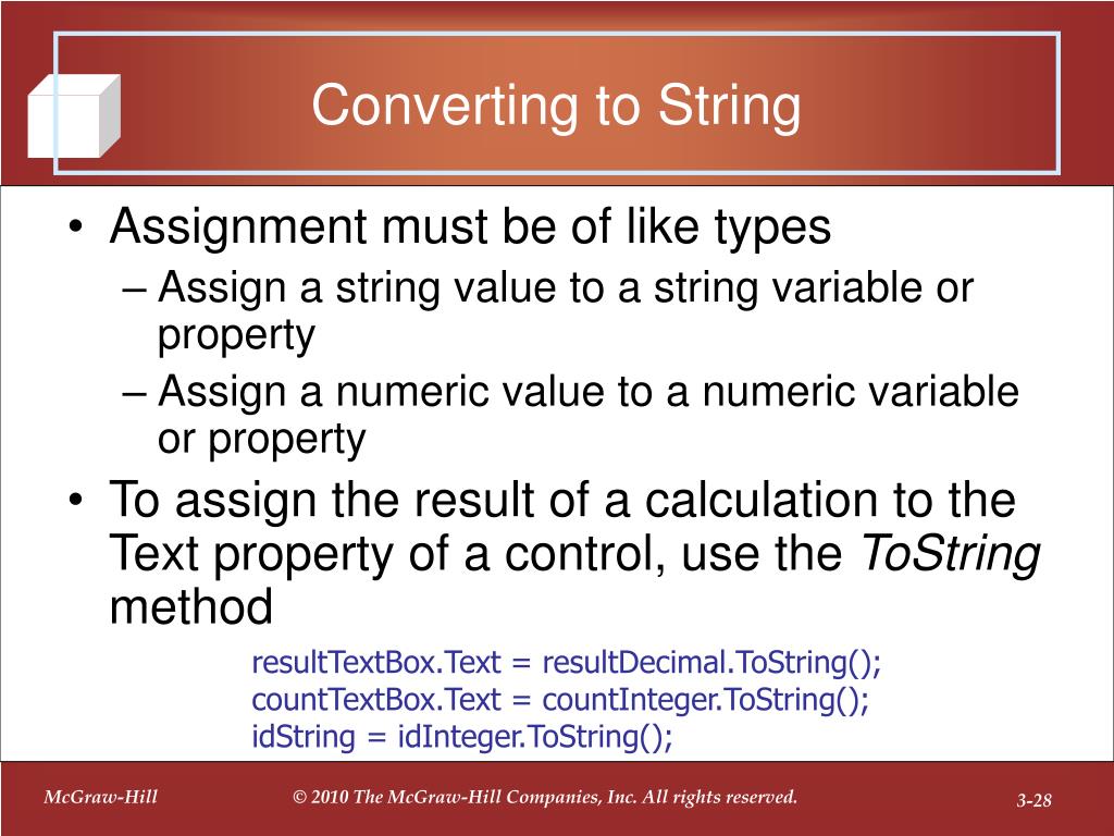 Converting to String • Assignment must be of like types • Assign a string value to a string variable or property • Assign a numeric value to a numeric variable or property • To assign the result of a calculation to the Text property of a control, use the ToString method resultTextBox.Text = resultDecimal.ToString(); countTextBox.Text = countInteger.ToString(); idString = idInteger.ToString();