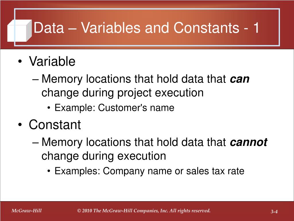 Data – Variables and Constants - 1 • Variable • Memory locations that hold data that can change during project execution • Example: Customer's name • Constant • Memory locations that hold data that cannot change during execution • Examples: Company name or sales tax rate