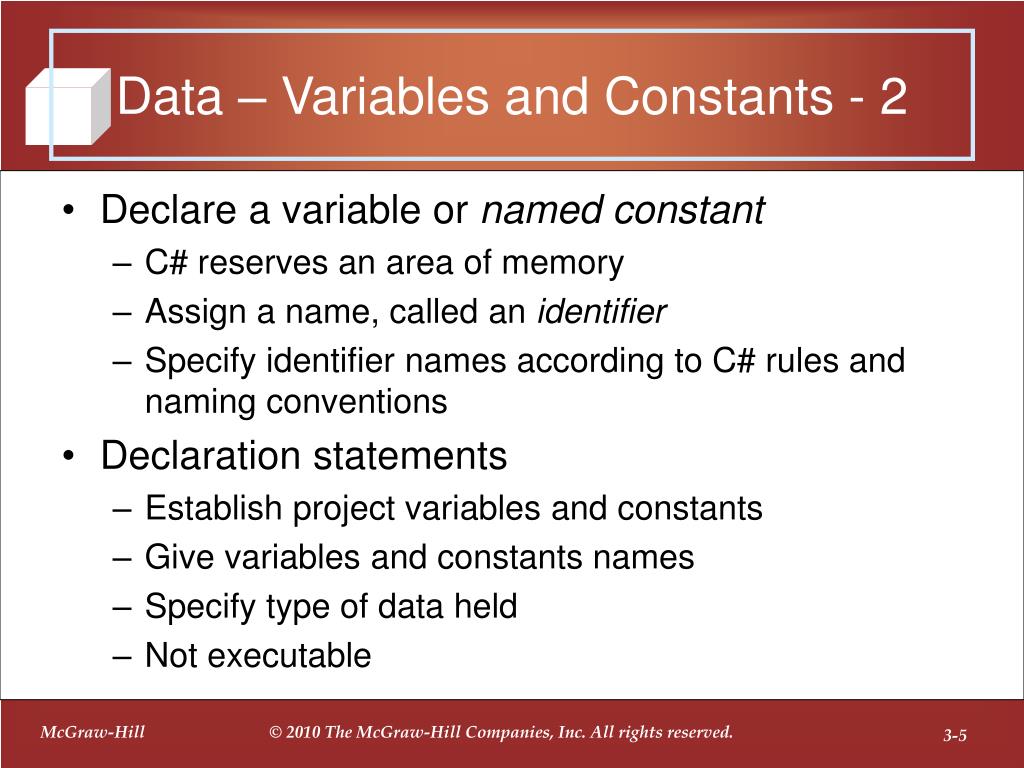 Data – Variables and Constants - 2 • Declare a variable or named constant • C# reserves an area of memory • Assign a name, called an identifier • Specify identifier names according to C# rules and naming conventions • Declaration statements • Establish project variables and constants • Give variables and constants names • Specify type of data held • Not executable