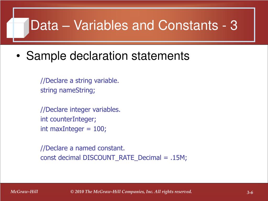 Data – Variables and Constants - 3 • Sample declaration statements //Declare a string variable. string nameString; //Declare integer variables. int counterInteger; int maxInteger = 100; //Declare a named constant. const decimal DISCOUNT_RATE_Decimal = .15M;