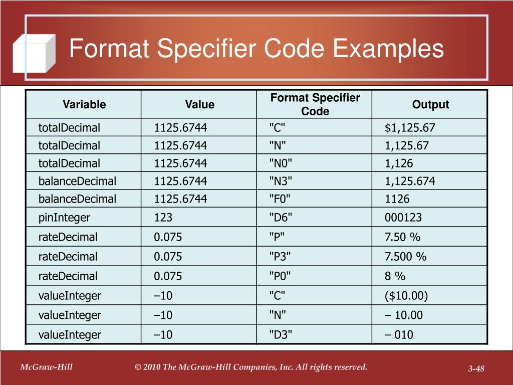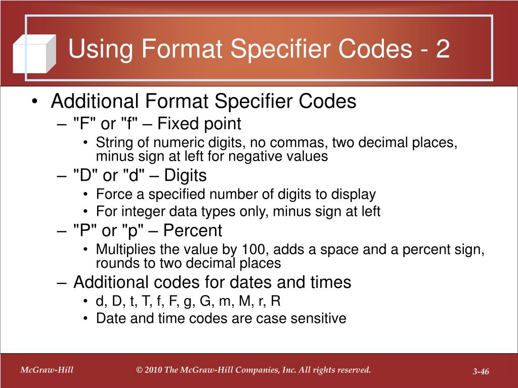 Using Format Specifier Codes - 2 • Additional Format Specifier Codes • "F" or "f" – Fixed point • String of numeric digits, no commas, two decimal places, minus sign at left for negative values • "D" or "d" – Digits • Force a specified number of digits to display • For integer data types only, minus sign at left • "P" or "p" – Percent • Multiplies the value by 100, adds a space and a percent sign, rounds to two decimal places • Additional codes for dates and times • d, D, t, T, f, F, g, G, m, M, r, R • Date and time codes are case sensitive