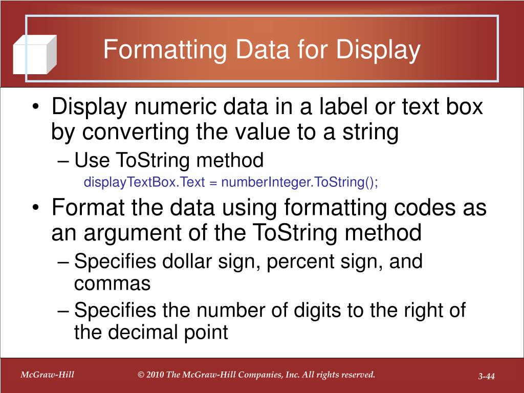 Formatting Data for Display • Display numeric data in a label or text box by converting the value to a string • Use ToString method displayTextBox.Text = numberInteger.ToString(); • Format the data using formatting codes as an argument of the ToString method • Specifies dollar sign, percent sign, and commas • Specifies the number of digits to the right of the decimal point