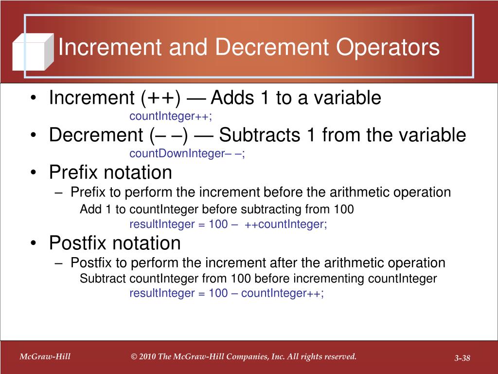 Increment and Decrement Operators • Increment (++) — Adds 1 to a variable countInteger++; • Decrement (– –) — Subtracts 1 from the variable countDownInteger– –; • Prefix notation • Prefix to perform the increment before the arithmetic operation Add 1 to countInteger before subtracting from 100 resultInteger = 100 – ++countInteger; • Postfix notation • Postfix to perform the increment after the arithmetic operation Subtract countInteger from 100 before incrementing countInteger resultInteger = 100 – countInteger++;