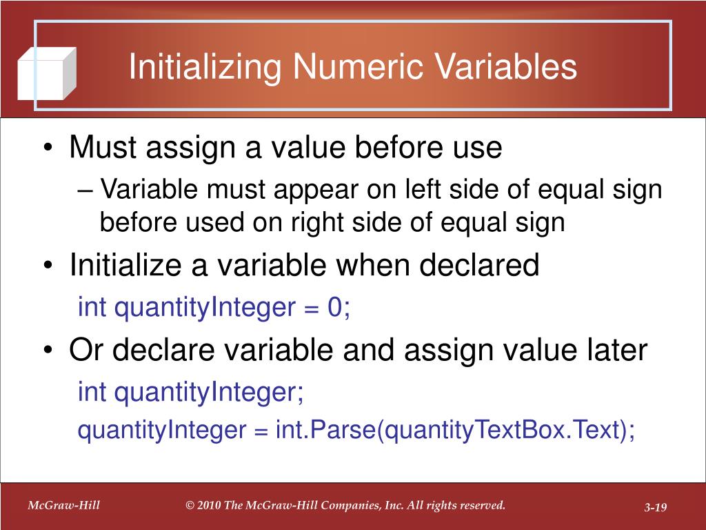 Initializing Numeric Variables • Must assign a value before use • Variable must appear on left side of equal sign before used on right side of equal sign • Initialize a variable when declared int quantityInteger = 0; • Or declare variable and assign value later int quantityInteger; quantityInteger = int.Parse(quantityTextBox.Text);