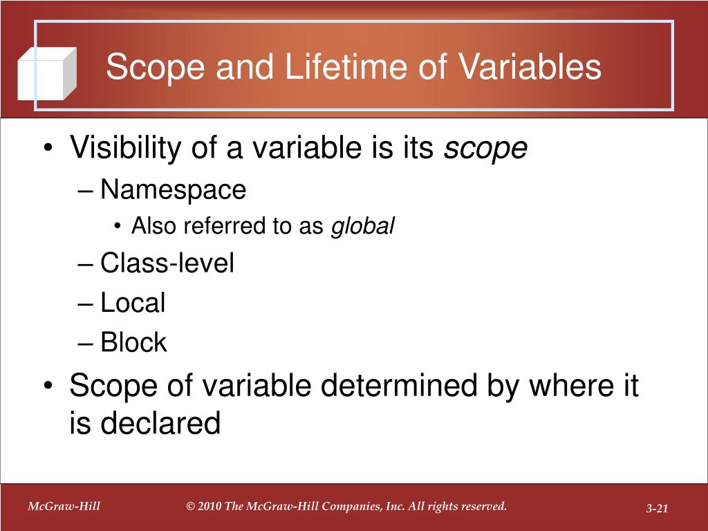 Scope and Lifetime of Variables • Visibility of a variable is its scope • Namespace • Also referred to as global • Class-level • Local • Block • Scope of variable determined by where it is declared