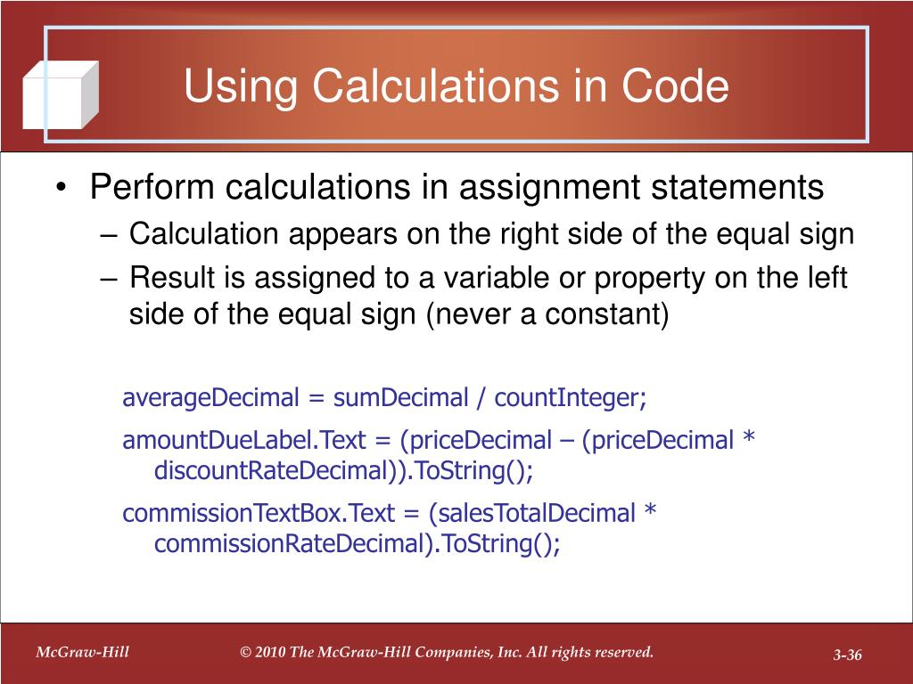 Using Calculations in Code • Perform calculations in assignment statements • Calculation appears on the right side of the equal sign • Result is assigned to a variable or property on the left side of the equal sign (never a constant) averageDecimal = sumDecimal / countInteger; amountDueLabel.Text = (priceDecimal – (priceDecimal * discountRateDecimal)).ToString(); commissionTextBox.Text = (salesTotalDecimal * commissionRateDecimal).ToString();
