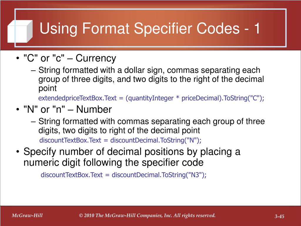 Using Format Specifier Codes - 1 • "C" or "c" – Currency • String formatted with a dollar sign, commas separating each group of three digits, and two digits to the right of the decimal point extendedpriceTextBox.Text = (quantityInteger * priceDecimal).ToString("C"); • "N" or "n" – Number • String formatted with commas separating each group of three digits, two digits to right of the decimal point discountTextBox.Text = discountDecimal.ToString("N"); • Specify number of decimal positions by placing a numeric digit following the specifier code discountTextBox.Text = discountDecimal.ToString("N3");
