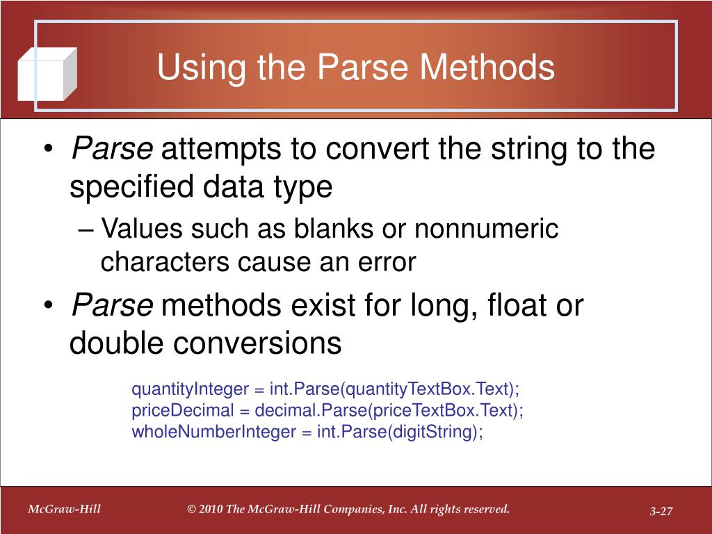 Using the Parse Methods • Parse attempts to convert the string to the specified data type • Values such as blanks or nonnumeric characters cause an error • Parse methods exist for long, float or double conversions quantityInteger = int.Parse(quantityTextBox.Text); priceDecimal = decimal.Parse(priceTextBox.Text); wholeNumberInteger = int.Parse(digitString);