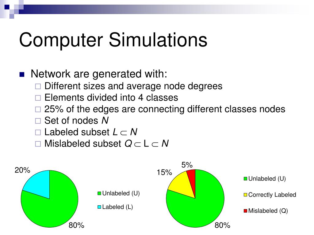 Computer Simulations • Network are generated with: • Different sizes and average node degrees • Elements divided into 4 classes • 25% of the edges are connecting different classes nodes • Set of nodes N • Labeled subset L N • Mislabeled subset Q L N