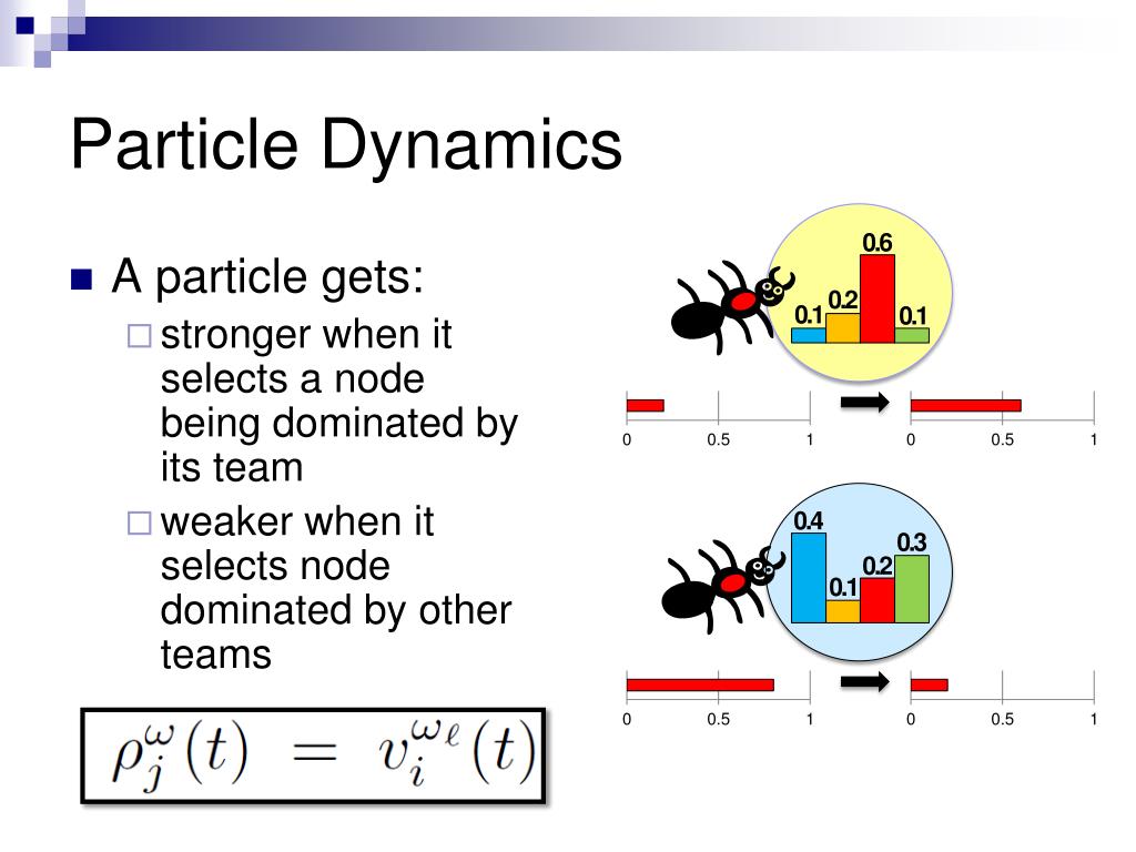 Particle Dynamics 0.6 0.2 0.1 0.1 0.4 0.3 0.2 0.1 • A particle gets: • stronger when it selects a node being dominated by its team • weaker when it selects node dominated by other teams