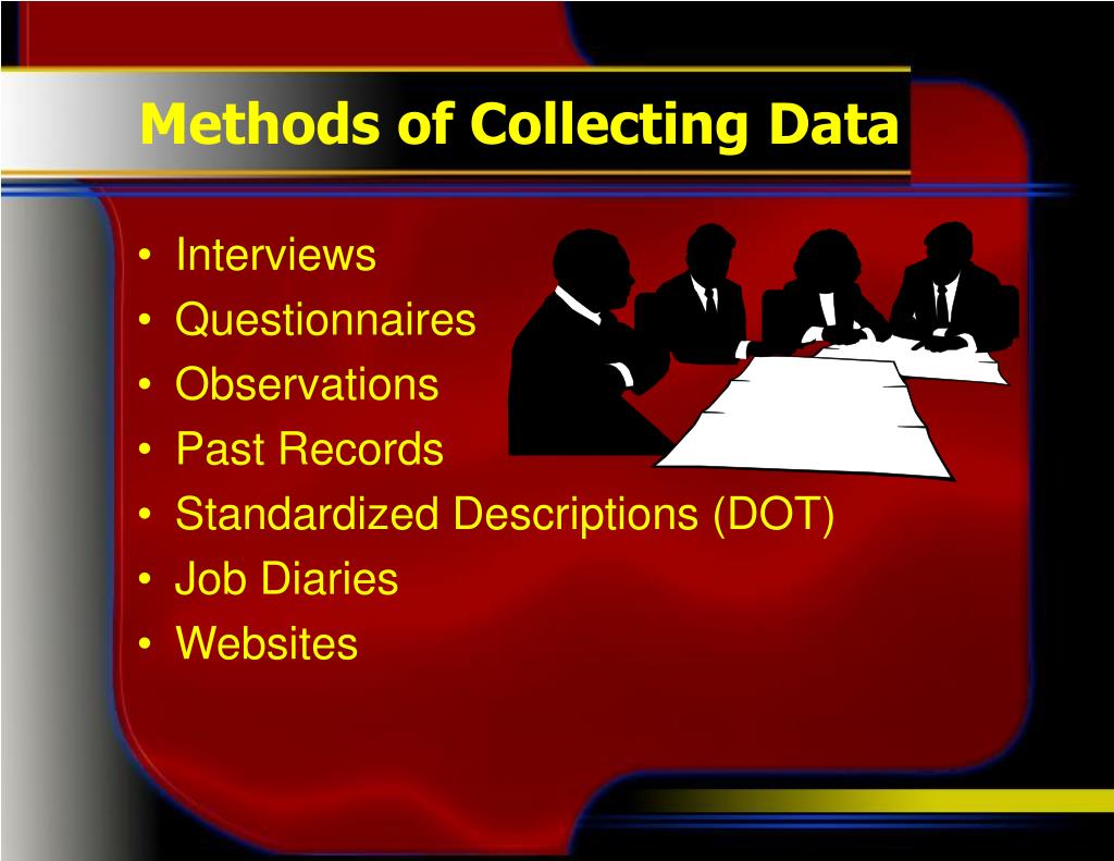 Methods of Collecting Data • Interviews • Questionnaires • Observations • Past Records • Standardized Descriptions (DOT) • Job Diaries • Websites