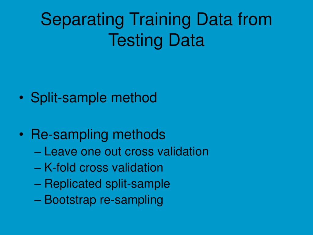 Separating Training Data from Testing Data • Split-sample method • Re-sampling methods • Leave one out cross validation • K-fold cross validation • Replicated split-sample • Bootstrap re-sampling
