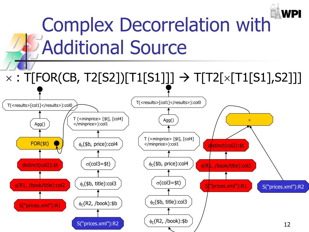 Complex Decorrelation with Additional Source : T[FOR(CB, T2[S2])[T1[S1]]] T[T2[[T1[S1],S2]]] T(<results>[col1]</results>):col0 T(<results>[col1]</results>):col0 T (<minprice> [$t], [col4] </minprice>):col1 Agg() Agg() T (<minprice> [$t], [col4] </minprice>):col1 FOR($t) c($b, price):col4 distinct(col2):$t C($b, price):col4 (col3=$t) distinct(col2):$t (R1, /book/title):col2 (col3=$t) c($b, title):col3 (R1, /book/title):col2 S(“prices.xml”):R1 S(“prices.xml”):R2 C($b, title):col3 C(R2, /book):$b S(“prices.xml”):R1 C(R2, /book):$b S(“prices.xml”):R2