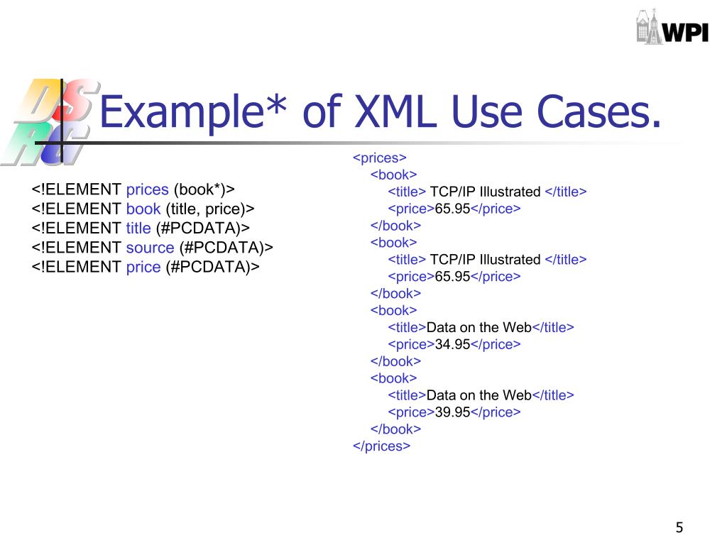 Example* of XML Use Cases. <prices> <book> <title> TCP/IP Illustrated </title> <price>65.95</price> </book> <book> <title> TCP/IP Illustrated </title> <price>65.95</price> </book> <book> <title>Data on the Web</title> <price>34.95</price> </book> <book> <title>Data on the Web</title> <price>39.95</price> </book> </prices> <!ELEMENT prices (book*)> <!ELEMENT book (title, price)> <!ELEMENT title (#PCDATA)> <!ELEMENT source (#PCDATA)> <!ELEMENT price (#PCDATA)>