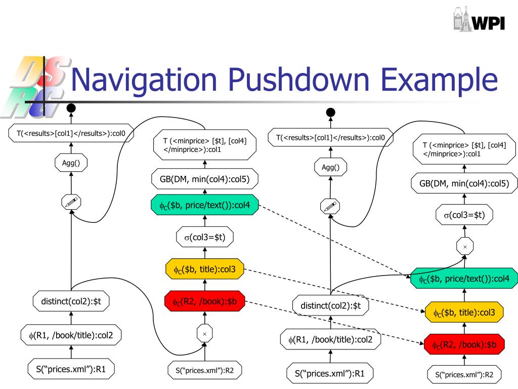 Navigation Pushdown Example T(<results>[col1]</results>):col0 T(<results>[col1]</results>):col0 T (<minprice> [$t], [col4] </minprice>):col1 T (<minprice> [$t], [col4] </minprice>):col1 Agg() Agg() GB(DM, min(col4):col5) GB(DM, min(col4):col5) C($b, price/text()):col4 (col3=$t) (col3=$t) C($b, title):col3 C($b, price/text()):col4 distinct(col2):$t C(R2, /book):$b distinct(col2):$t C($b, title):col3 (R1, /book/title):col2 (R1, /book/title):col2 C(R2, /book):$b S(“prices.xml”):R1 S(“prices.xml”):R2 S(“prices.xml”):R1 S(“prices.xml”):R2