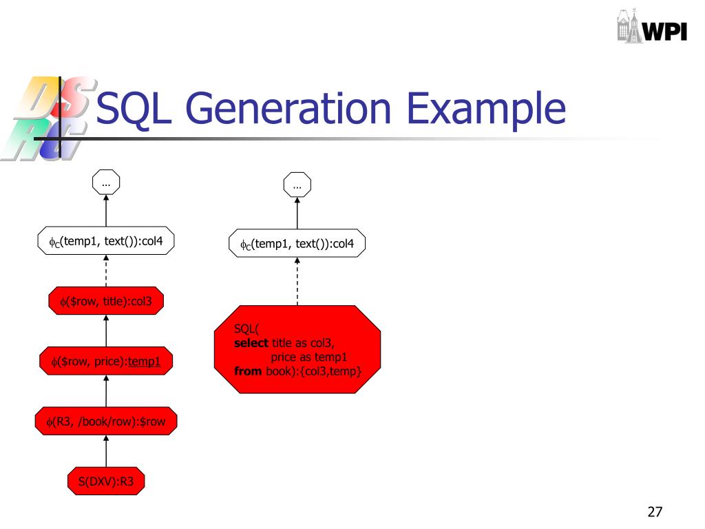 SQL Generation Example ... ... C(temp1, text()):col4 C(temp1, text()):col4 ($row, title):col3 SQL( select title as col3, price as temp1 from book):{col3,temp} ($row, price):temp1 (R3, /book/row):$row S(DXV):R3