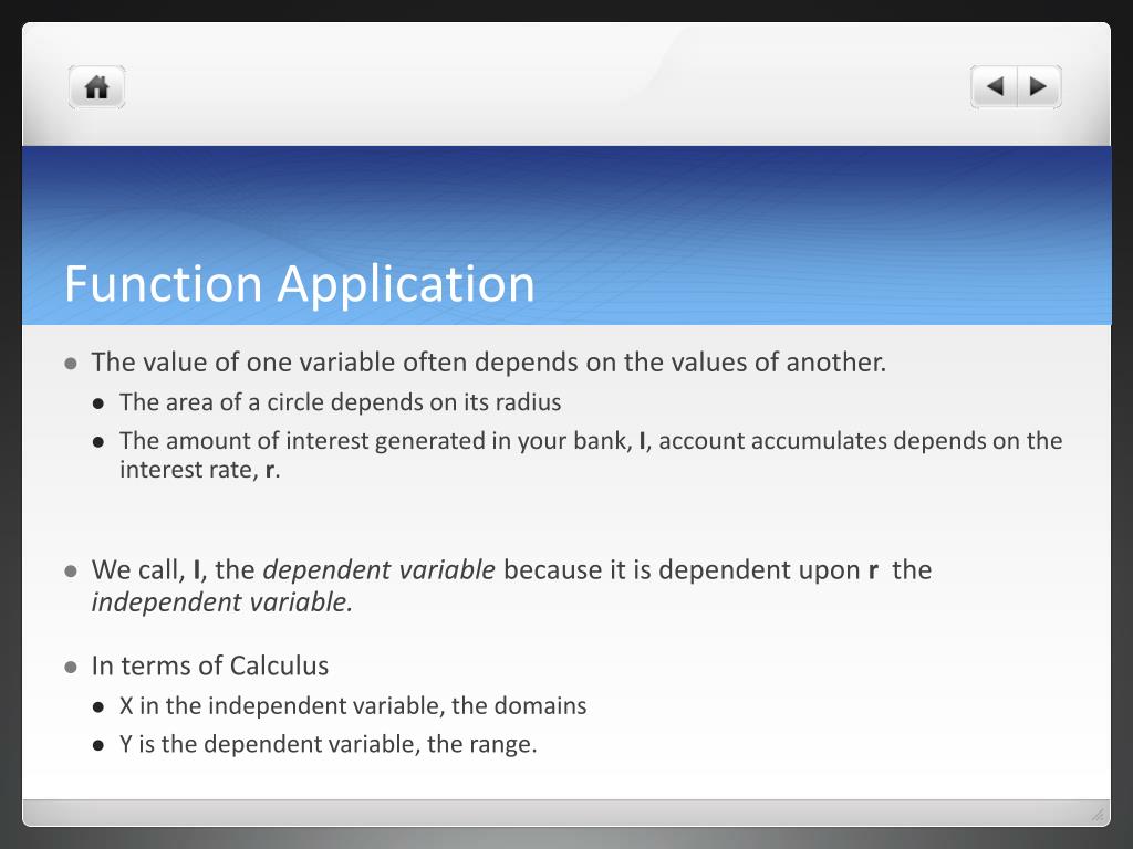 Function Application • The value of one variable often depends on the values of another. • The area of a circle depends on its radius • The amount of interest generated in your bank, I, account accumulates depends on the interest rate, r. • We call, I, the dependent variable because it is dependent upon r the independent variable. • In terms of Calculus • X in the independent variable, the domains • Y is the dependent variable, the range.