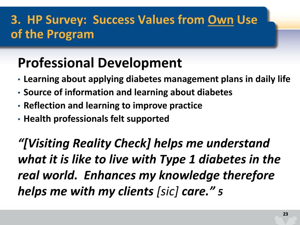 3. HP Survey: Success Values from Own Use of the Program • Professional Development • Learning about applying diabetes management plans in daily life • Source of information and learning about diabetes • Reflection and learning to improve practice • Health professionals felt supported • “[Visiting Reality Check] helps me understand what it is like to live with Type 1 diabetes in the real world. Enhances my knowledge therefore helps me with my clients [sic] care.” 5 23