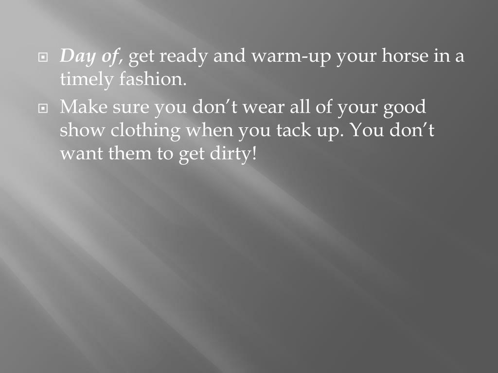 Day of, get ready and warm-up your horse in a timely fashion. • Make sure you don’t wear all of your good show clothing when you tack up. You don’t want them to get dirty!