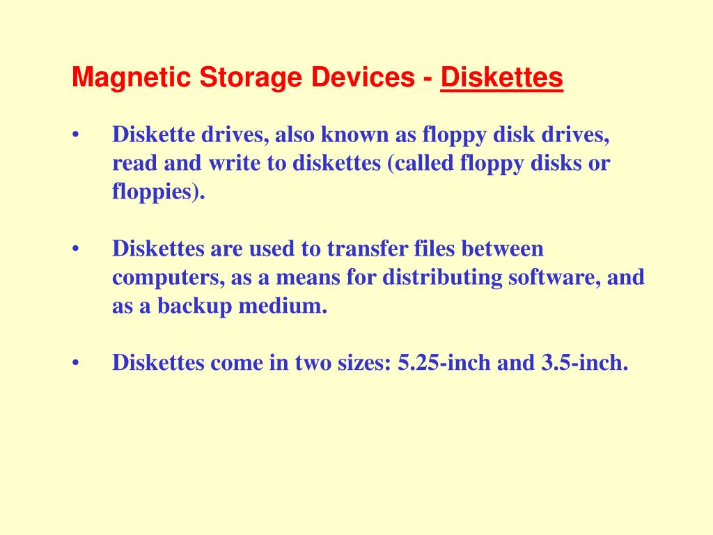 Magnetic Storage Devices - Diskettes • Diskette drives, also known as floppy disk drives, read and write to diskettes (called floppy disks or floppies). • Diskettes are used to transfer files between computers, as a means for distributing software, and as a backup medium. • Diskettes come in two sizes: 5.25-inch and 3.5-inch.