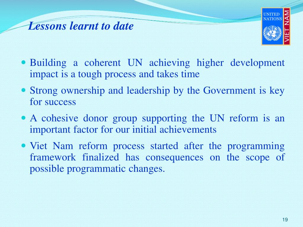 Lessons learnt to date • Building a coherent UN achieving higher development impact is a tough process and takes time • Strong ownership and leadership by the Government is key for success • A cohesive donor group supporting the UN reform is an important factor for our initial achievements • Viet Nam reform process started after the programming framework finalized has consequences on the scope of possible programmatic changes.